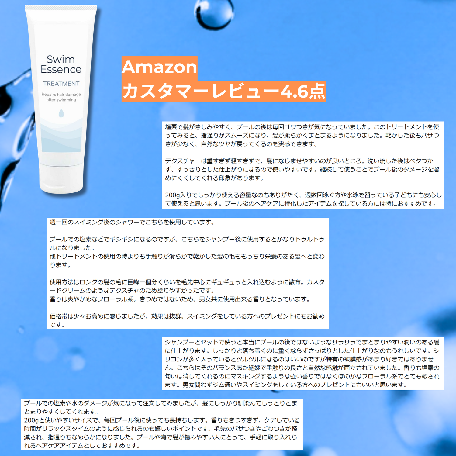 ・プールの後ではないようなサラサラでまとまりやすい潤いのある髪に仕上がります。しっかりと落ち着くのに重くならずさっぱりとした仕上がりなのもうれしいです。